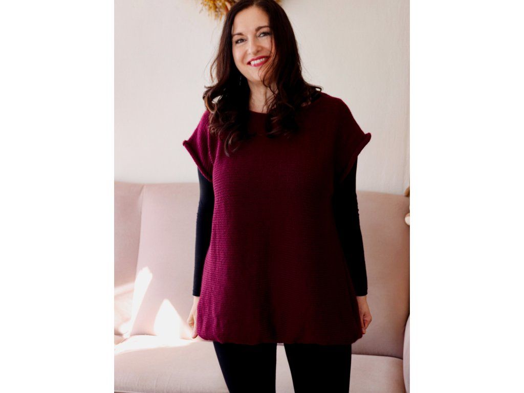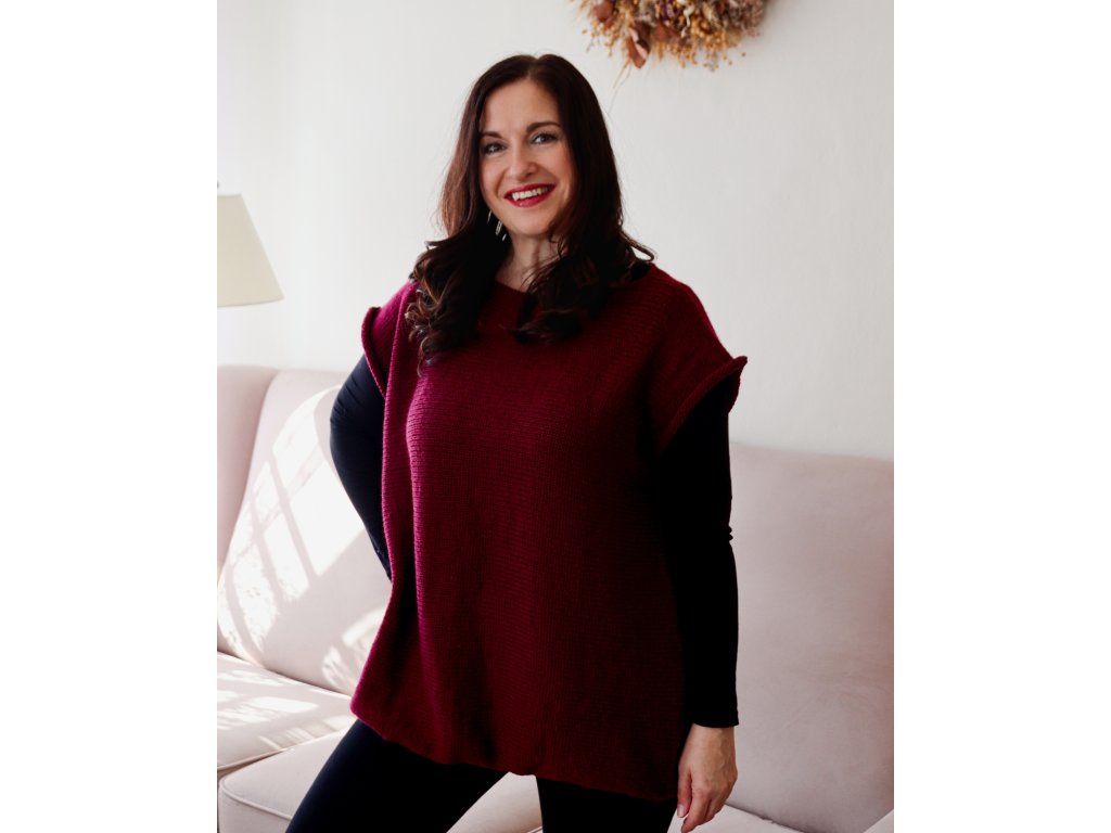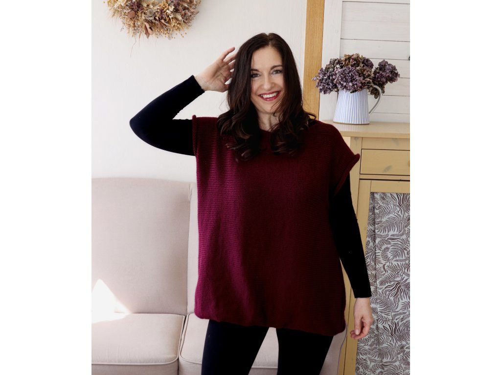 Vesta je pletená z velmi kvalitní 100% merino vlny. Je příjemná, hřejivá a hodně oversize. Barva je krásná vínová.